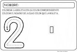 Al igual que ocurre con las fichas del número 1, yo trabajo las regletas Cuisenaire. Por lo que, han de repasar el trazo con lápiz, primero, y, con rotulador después; además de colorear el número y la regleta del color correspondiente.